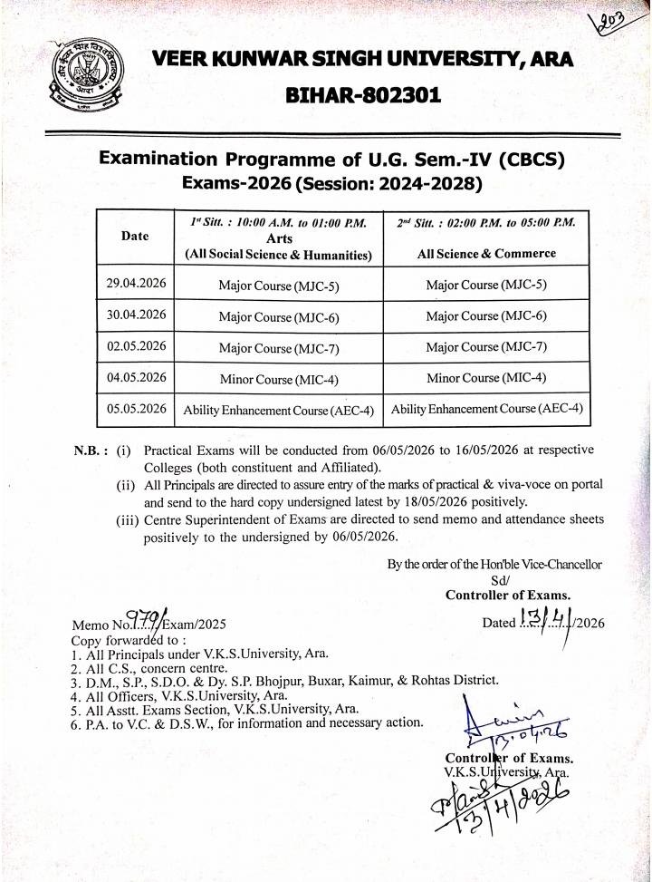 VKSU द्वारा जारी आधिकारिक सूचना के अनुसार UG Semester 4 परीक्षा 29 अप्रैल 2026 से 05 मई 2026 तक आयोजित की जाएगी। BA, BSc और BCom CBCS के सभी छात्र निर्धारित तिथियों के अनुसार परीक्षा में शामिल होंगे। परीक्षा में बैठने के लिए एडमिट कार्ड अनिवार्य दस्तावेज है, इसलिए सभी छात्र समय रहते इसे डाउनलोड कर लें।